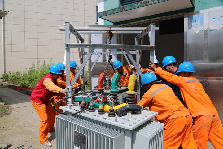 現(xiàn)場,施工人員8個人一組,把老舊的電纜拆除,將新的線徑更粗的電纜穿過地下孔洞,繞到配電室一側(cè),再重新搭接線路。停電、驗電、吊離變壓器,安裝新變壓器……供電員工沒有片刻停頓,每個步驟有條不紊,迅速完成增容任務。